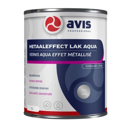Avis Metaaleffect Lak Aqua – Zilver (voorheen Aqua Metallics) is waterverdunbare Metallic verf die geschikt is voor het decoratief aflakken van harde kunststoffen (PVC), zink, aluminium, hout, styropoor, ijzer, glasvezel, structuurbehang, pleister, beton en hobbyartikelen.