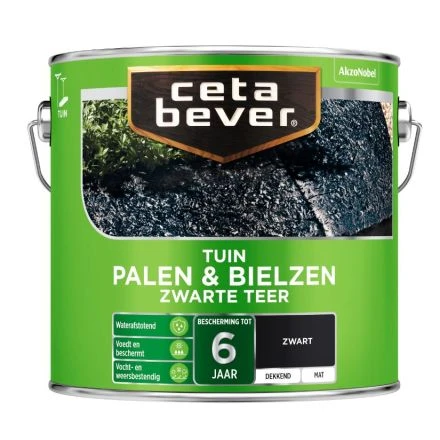 Cetabever Zwarte Teer is een matte beits voor buiten op terpentinebasis. Cetabever Palen & Bielzen Zwarte Teer kan toegepast worden op palen, bielzen of geïmpregneerde rolborders. Hierbij maakt het niet uit of het gaat om kale ondergronden of oppervlakken die eerder behandeld zijn met Cetabever Zwarte Teer of carbolineum. Deze vocht- en weerbestendige teer voor palen is stoot water af en biedt gemiddeld zes jaar bescherming. Bovendien biedt deze Cetabever Zwarte Teer voor houten palen niet alleen bescherming, maar voedt het ook het hout