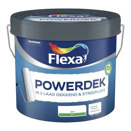 Flexa Powerdek is een matte, vochtregulerende muurverf voor binnen. Gebruiksklaar maar indien nodig te verdunnen met een beetje schoon water. Flexa Powerdek is uitermate geschikt voor ondergronden zoals baksteen, gipsplaten, stucwerk en schoon metselwerk.