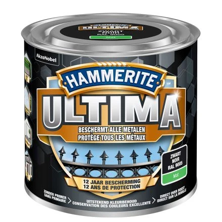 Hammerite Ultima – Mat is een beschermende, roestwerende matte metaallak voor buiten. Hammerite Ultima – Mat kan zonder primer of grondverf direct op alle metalen en over geroeste delen worden geschilderd. Denk hierbij aan roestige metalen (ijzer, staal) en kale nonferro metalen ondergronden (zink, aluminium, verzinkt staal, etc.) Ook is Hammerite Ultima geschikt voor reeds geschilderde metalen ondergronden.Hammerite Ultima Mat is een lobbige verf.Breng voldoende laagdikte aan, volgens het voorgeschreven rendement.