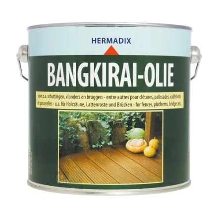 Hermadix Bangkirai Olie is een watergedragen Bangkirai olie die geen oplosmiddelen bevat en dus minder milieubelastend is. Hermadix Bangkirai Olie droogt snel, geeft langdurige, waterafstotende bescherming en voorkomt vergrijzing en vervuiling. De mooie, warme uitstraling van Bangkirai hardhout gaat namelijk verloren door weersinvloeden als u het niet op tijd behandelt. Bangkirai wordt dan vuil en grijs en vlonders kunnen gevaarlijk glad worden door aanhechting van algen.