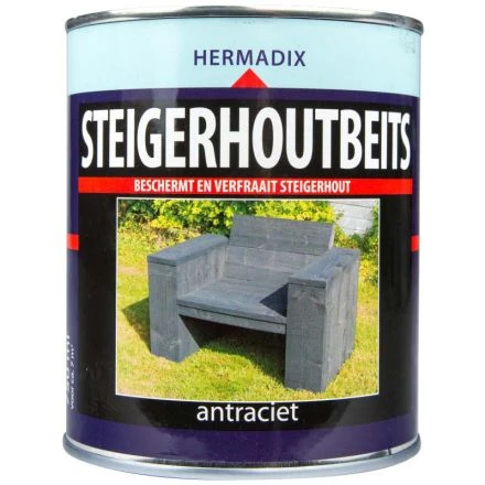 Hermadix Steigerhoutbeits is een watergedragen, mens- en milieuvriendelijke beits op basis van natuurlijke oliën waardoor je een matte finish krijgt. Deze steigerhoutbeits geeft een duurzame bescherming en laat geen nare verflucht na. Hermadix Steigerhoutbeits is speciaal ontwikkeld voor nieuw- en oud steigerhout. Hermadix Steigerhoutbeits is een beits die goed indringt in het hout, snel droogt en gemakkelijk te verwerken is. In veel gevallen is 1 laag Hermadix Steigerhoutbeits voldoende voor een prachtig resultaat.Het voordeel van Hermadix is dat je bij onderhoudslagen niet hoeft te schuren. Schoonmaken en ontvetten is voldoende.