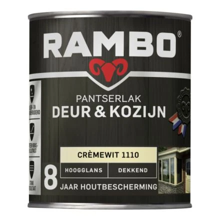Rambo Pantserlak Deur & Kozijn Hoogglans Crèmewit is een hoogglanzende luchtdrogende lakverf op terpentinebasis. Rambo Pantserlak Deur & Kozijn Hoogglans is goed reinigbaar, goed dekkend en weersbestendig. Rambo Pantserlak Deur & Kozijn Hoogglans is geschikt voor het aflakken van hout en andere ondergronden zoals kozijnen, ramen, deuren, betimmering en daklijsten.
