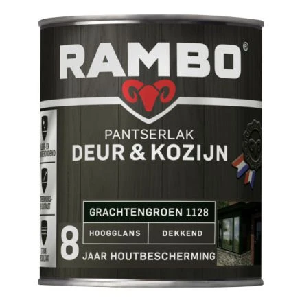Rambo Pantserlak Deur & Kozijn Hoogglans Grachtengroen is een hoogglanzende luchtdrogende lakverf op terpentinebasis. Rambo Pantserlak Deur & Kozijn Hoogglans is goed reinigbaar, goed dekkend en weersbestendig. Rambo Pantserlak Deur & Kozijn Hoogglans is geschikt voor het aflakken van hout en andere ondergronden zoals kozijnen, ramen, deuren, betimmering en daklijsten.