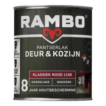 Rambo Pantserlak Deur & Kozijn Hoogglans Klassiek Rood is een hoogglanzende luchtdrogende lakverf op terpentinebasis. Rambo Pantserlak Deur & Kozijn Hoogglans is goed reinigbaar, goed dekkend en weersbestendig. Rambo Pantserlak Deur & Kozijn Hoogglans is geschikt voor het aflakken van hout en andere ondergronden zoals kozijnen, ramen, deuren, betimmering en daklijsten.