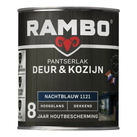 Rambo Pantserlak Deur & Kozijn Hoogglans Nachtblauw is een hoogglanzende luchtdrogende lakverf op terpentinebasis. Rambo Pantserlak Deur & Kozijn Hoogglans is goed reinigbaar, goed dekkend en weersbestendig. Rambo Pantserlak Deur & Kozijn Hoogglans is geschikt voor het aflakken van hout en andere ondergronden zoals kozijnen, ramen, deuren, betimmering en daklijsten.