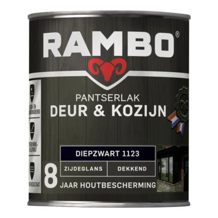 Rambo Pantserlak Deur & Kozijn Zijdeglans Diepzwart is een extra goed dekkende zijdeglanzende lakverf op terpentinebasis. Rambo Pantserlak Deur & Kozijn Zijdeglans is goed reinigbaar, extreem krast- en lijtvast en weersbestendig. Rambo Pantserlak Deur & Kozijn Zijdeglans is geschikt voor het aflakken van hout en andere ondergronden zoals kozijnen, ramen, deuren, betimmering en daklijsten.