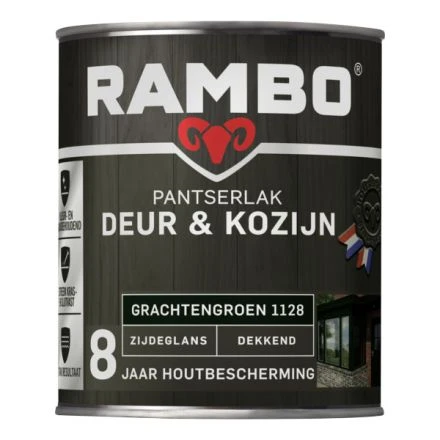 Rambo Pantserlak Deur & Kozijn Zijdeglans Grachtengroen is een extra goed dekkende zijdeglanzende lakverf op terpentinebasis. Rambo Pantserlak Deur & Kozijn Zijdeglans is goed reinigbaar, extreem krast- en lijtvast en weersbestendig. Rambo Pantserlak Deur & Kozijn Zijdeglans is geschikt voor het aflakken van hout en andere ondergronden zoals kozijnen, ramen, deuren, betimmering en daklijsten.