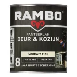 Rambo Pantserlak Deur & Kozijn Zijdeglans Ivoorwit is een extra goed dekkende zijdeglanzende lakverf op terpentinebasis. Rambo Pantserlak Deur & Kozijn Zijdeglans is goed reinigbaar, extreem krast- en lijtvast en weersbestendig. Rambo Pantserlak Deur & Kozijn Zijdeglans is geschikt voor het aflakken van hout en andere ondergronden zoals kozijnen, ramen, deuren, betimmering en daklijsten.