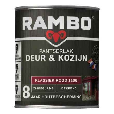 Rambo Pantserlak Deur & Kozijn Zijdeglans Klassiek Rood is een extra goed dekkende zijdeglanzende lakverf op terpentinebasis. Rambo Pantserlak Deur & Kozijn Zijdeglans is goed reinigbaar, extreem krast- en lijtvast en weersbestendig. Rambo Pantserlak Deur & Kozijn Zijdeglans is geschikt voor het aflakken van hout en andere ondergronden zoals kozijnen, ramen, deuren, betimmering en daklijsten.