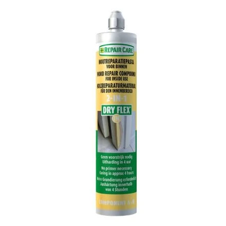Repair Care Dry Flex IN is een reparatiepasta voor repareren van beschadigd hout binnenshuis. Per laag is 5 to 22mm aan te brengen. Mits de vorige laag goed is uitgehard en geschuurd kunnen er meerdere lagen worden aangebracht. Repair Care Dry Flex IN is aan te brengen zonder voorstrijkmiddel.