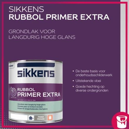 Met Sikkens Rubbol Primer Extra heb je de beste basis voor je onderhoudsschilderwerk. Sikkens Rubbol Primer Extra is een goed vullende en goed dekkende grondverf voor buiten. Sikkens Rubbol Primer Extra is geschikt als grond- en voorlak onder een duurzaam hoogglans systeem. Verder is Sikkens Rubbol Primer Extra geschikt voor het gronden en overgronden van geveltimmerwerk, het overgronden van reeds voorbehandelde metalen en harde kunststoffen. Sikkens Rubbol Primer Extra kan zonder bezwaar 1 jaar onafgeschilderd overstaan mits 2 lagen aangebracht.